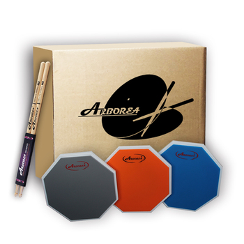 अभ्यास Arborea ड्रम पैड और 5A drumsticks ड्रम का एक सेट